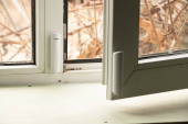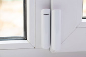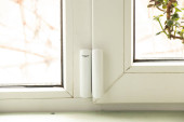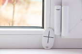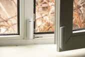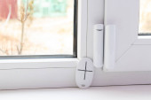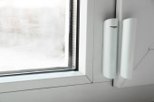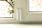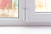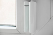 czujnik otwarcia okna wiszący na oknie, system alarmowy domu, ochrona domu, alarm domowy