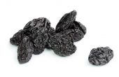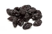 Kupa słodkich suszonych śliwek na białym tle, widok z góry
