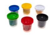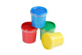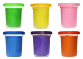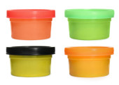 Plastikowe pojemniki z kolorowym ciastem grać na białym tle