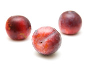 Światło czerwone dojrzałe śliwki duże; Krawędź pozioma; pięciu owoców; na białym tle na whi