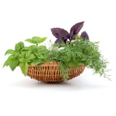 Świeże przyprawy i zioła w wiklinowym koszu na białym tle na białe tło wyłącznik. Sweet basil, pozostawia czerwona bazylia, koperek i pietruszka.