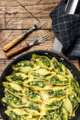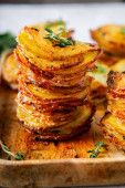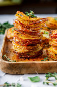 Zdjęcie "Zapiekanka ziemniaczana Gratin Dauphinois w naczyniu do pieczenia. Ciemne drewniane tło. Widok z góry" może być wykorzystywane do celów osobistych i komercyjnych zgodnie z warunkami zakupionej licencji Royalty-free. Obraz jest dostępny do pobrania w jakości wysokiej rozdzielczości do 5760x3840.