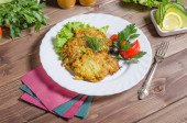 Mięso galaretowate z kawałkami mięsa z warzywami i ziołami na białym talerzu na ciemnym drewnianym tle