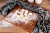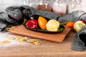 Skład kuchni, designerska deska drewniana, warzywa, ręcznik kuchenny we wnętrzu