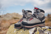 Zdjęcie "Buty turystyczne po wyschnięciu. Mokre buty turystyczne suche na kamieniu na tle pokrytych śniegiem wysokich gór. Trudności z uprawianiem turystyki pieszej, suszenie ubrań w naturze." może być wykorzystywane do celów osobistych i komercyjnych zgodnie z warunkami zakupionej licencji Royalty-free. Obraz jest dostępny do pobrania w jakości wysokiej rozdzielczości do 5760x3840.