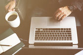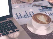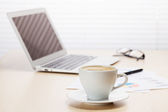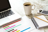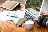 laptop, tabletki, smartphone i kawy kubek z finansowych docume
