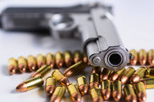 Kule pistoletowe na drewnianym stole, zbliżenie. Pistolet profesjonalny