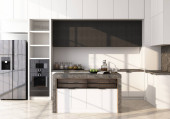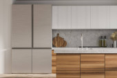 Drewniane wnętrze kuchenne z kuchenką, piekarnikiem i przyborami kuchennymi, widok z przodu. Luksusowa kuchnia z lodówką na lekkiej parkiecie, renderowanie 3D