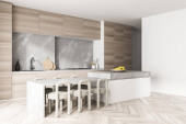 Zdjęcie "Drewniane wnętrze kuchenne z kuchenką, piekarnikiem i przyborami kuchennymi, widok z przodu. Luksusowa kuchnia z lodówką na lekkiej parkiecie, renderowanie 3D" może być wykorzystywane do celów osobistych i komercyjnych zgodnie z warunkami zakupionej licencji Royalty-free. Obraz jest dostępny do pobrania w jakości wysokiej rozdzielczości do 5760x3840.