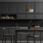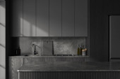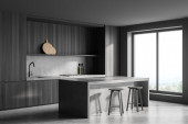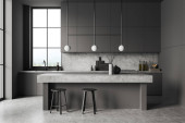 Zdjęcie "Wnętrze gotowania z dwoma krzesłami barowymi i stołem, zlewem i przyborami kuchennymi z szarymi półkami, widok z przodu. Luksusowa kuchnia z minimalistycznymi meblami, renderowanie 3D" może być wykorzystywane do celów osobistych i komercyjnych zgodnie z warunkami zakupionej licencji Royalty-free. Obraz jest dostępny do pobrania w jakości wysokiej rozdzielczości do 5760x3840.