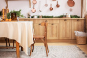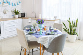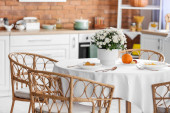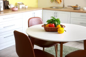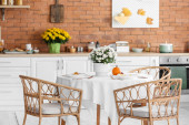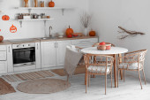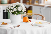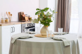 Zdjęcie "Stół z pięknymi kwiatami chryzantemy we wnętrzu nowoczesnej kuchni" może być wykorzystywane do celów osobistych i komercyjnych zgodnie z warunkami zakupionej licencji Royalty-free. Obraz jest dostępny do pobrania w jakości wysokiej rozdzielczości do 5760x3840.