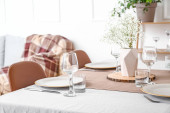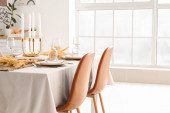 Stół z pięknymi kwiatami chryzantemy we wnętrzu nowoczesnej kuchni
