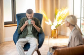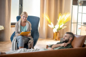 Zdjęcie "Syn i mama siedzą obok siebie i rozmawiają" może być wykorzystywane do celów osobistych i komercyjnych zgodnie z warunkami zakupionej licencji Royalty-free. Obraz jest dostępny do pobrania w jakości wysokiej rozdzielczości do 5760x3840.