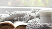 Przytulny dom z filiżanką kawy i książką. Styl Hygge. Kubek czarnej kawy owinięty w ciepłym szalik na drewnianej płycie. Widok z góry, styl Vintage, Martwa żywotność.