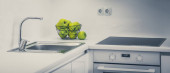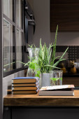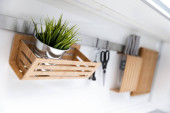 Drewniane półki na białej ścianie. Wystrój wnętrz. Rośliny zielone.