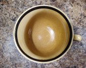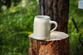 jeden biały brudny kubek stoi na szarych suchych gałęziach i roślinności na ulicy