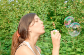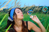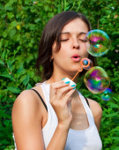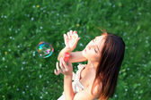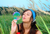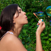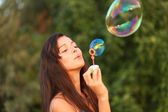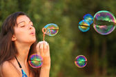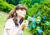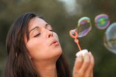 młoda dziewczyna dmuchanie baniek mydlanych w parku jesień