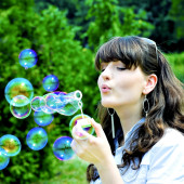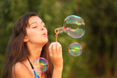 młoda dziewczyna dmuchanie baniek mydlanych w parku jesień