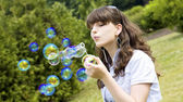młoda dziewczyna dmuchanie baniek mydlanych w parku jesień