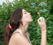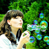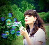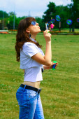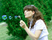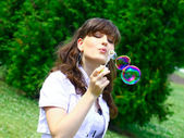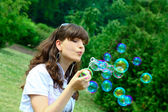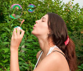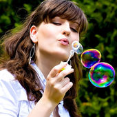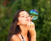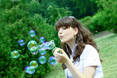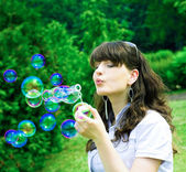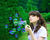 młoda dziewczyna dmuchanie baniek mydlanych w parku jesień