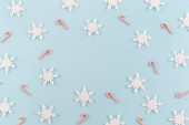 Baner wykonany z prezentów świątecznych i prezentów na białym tle. Wesołych Świąt, pomysł na Nowy Rok. Płaskie ułożenie, widok z góry