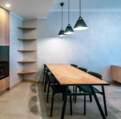 Nowoczesne wnętrze przestronnej, jasnej, drewnianej kuchni w mieszkaniu.