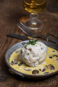 Kurczak w tarragonie z musztardą i cebulą perłową. Francuska kuchnia smakoszy. Zamknij się.