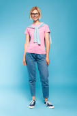 Pełna długość uśmiechniętej Afroamerykanki w okularach patrzącej w kamerę na białym tle