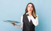 Latynoska piękna kobieta czuje się zdezorientowana i zdziwiona, pokazując, że jesteś szalona. koncepcja przestrzeni do kopiowania tablicy