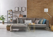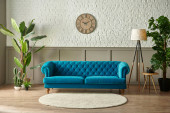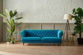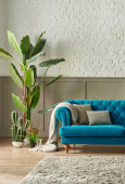 Zdjęcie "Niebieska pikowana sofa przed brązową klasyczną siatką i ścianą z białej cegły, wazon koc z zielonej lampy roślinnej, projekt zegara." może być wykorzystywane do celów osobistych i komercyjnych zgodnie z warunkami zakupionej licencji Royalty-free. Obraz jest dostępny do pobrania w jakości wysokiej rozdzielczości do 5760x3840.