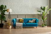 Niebieska pikowana sofa przed brązową klasyczną siatką i ścianą z białej cegły, wazon koc z zielonej lampy roślinnej, projekt zegara.
