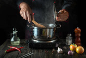 Szef kuchni gotuje pierogi mięsne w rondlu w kuchni restauracji. Zbliżenie rąk kucharza podczas pracy. Wolna przestrzeń reklamowa