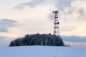 Dwa żurawie budowlane na śnieżnym pustkowiu w mieście
