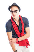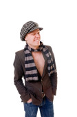 modne model mężczyzna ubrany w szary garnitur, szalik i kapelusz