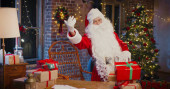 Święty Mikołaj i mały chłopiec kaukaski stoi w pobliżu i czeka na magiczny prezent świąteczny w pobliżu choinki w przytulnym salonie w zimie