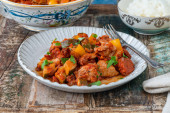 Jollof ryż - pikantne afrykańskie danie ryżowe z pieczonymi piersiami kurczaka i głęboko smażoną plantaną