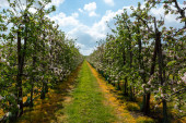 Wiosenny biały kwiat gruszek na sadach owocowych w Zeeland, Holandia