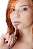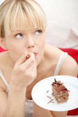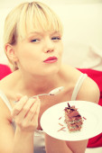 piękne kobiety na kanapie jedzenie ciasta.