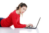 Zdjęcie "młoda kobieta w pracy na laptopie i uśmiechając się do kamery." może być wykorzystywane do celów osobistych i komercyjnych zgodnie z warunkami zakupionej licencji Royalty-free. Obraz jest dostępny do pobrania w jakości wysokiej rozdzielczości do 5760x3840.