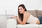 młoda kobieta w pracy na laptopie i uśmiechając się do kamery.