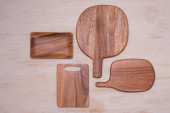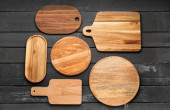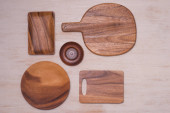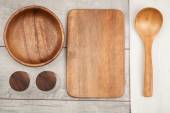 Zestaw naczyń kuchennych na drewnianym stole vintage z góry, drewniane tło