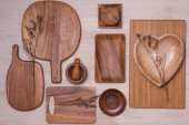 Zestaw naczyń kuchennych na drewnianym stole vintage z góry, drewniane tło