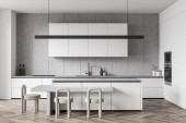 Stylowe wnętrze kuchni z trzema krzesłami i betonowym stołem, umywalka z przyborami kuchennymi, widok z przodu. Luksusowa kuchnia z parkietem, renderowanie 3D