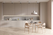 Zdjęcie "Wnętrze z drewnianymi krzesłami i marmurowym stołem do jedzenia z naczyniami, widok z przodu, okno na wieś. Luksusowa kuchnia z parkietem, renderowanie 3D" może być wykorzystywane do celów osobistych i komercyjnych zgodnie z warunkami zakupionej licencji Royalty-free. Obraz jest dostępny do pobrania w jakości wysokiej rozdzielczości do 5760x3840.
