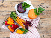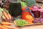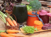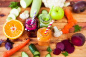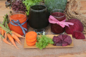 Świeżo wyciskana papryka koktajlowa, marchewka, warzywo z soku buraczanego w szklance. Zdrowe odżywianie, odtruwanie, dieta.