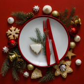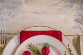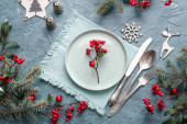 Ustawienie świątecznego miejsca na świąteczny obiad; Pusty biały talerz, widelec, nóż i gałązki jodły i jagody powyżej