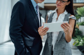 Biznes korporacyjny: Dwóch kolegów patrzących na laptopy i dyskutujących w miejscu pracy. Uśmiechnięty biznesmen wyjaśniający coś na laptopie pięknej bizneswoman stojąc przy biurku w nowoczesnym biurze.