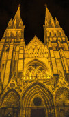 Noc poza oświetlonymi światłami Fasada katedry Bayeux Zamknij Kościół Matki Bożej Bayeux Bayeux Normandy Francja. Kościół katolicki poświęcony przez króla Wilhelma Zdobywcę w 1077 r.