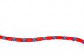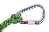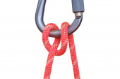 Zaczep przywiązany czerwoną liną na karabinku, izolowany na białym tle. Ten węzeł goździkowy używany do wspinaczki nazywa się Mastwurf po niemiecku i Noeud de cabestan po francusku.