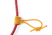 Zdjęcie "Zaczep przywiązany czerwoną liną na karabinku, izolowany na białym tle. Ten węzeł goździkowy używany do wspinaczki nazywa się Mastwurf po niemiecku i Noeud de cabestan po francusku." może być wykorzystywane do celów osobistych i komercyjnych zgodnie z warunkami zakupionej licencji Royalty-free. Obraz jest dostępny do pobrania w jakości wysokiej rozdzielczości do 5760x3840.